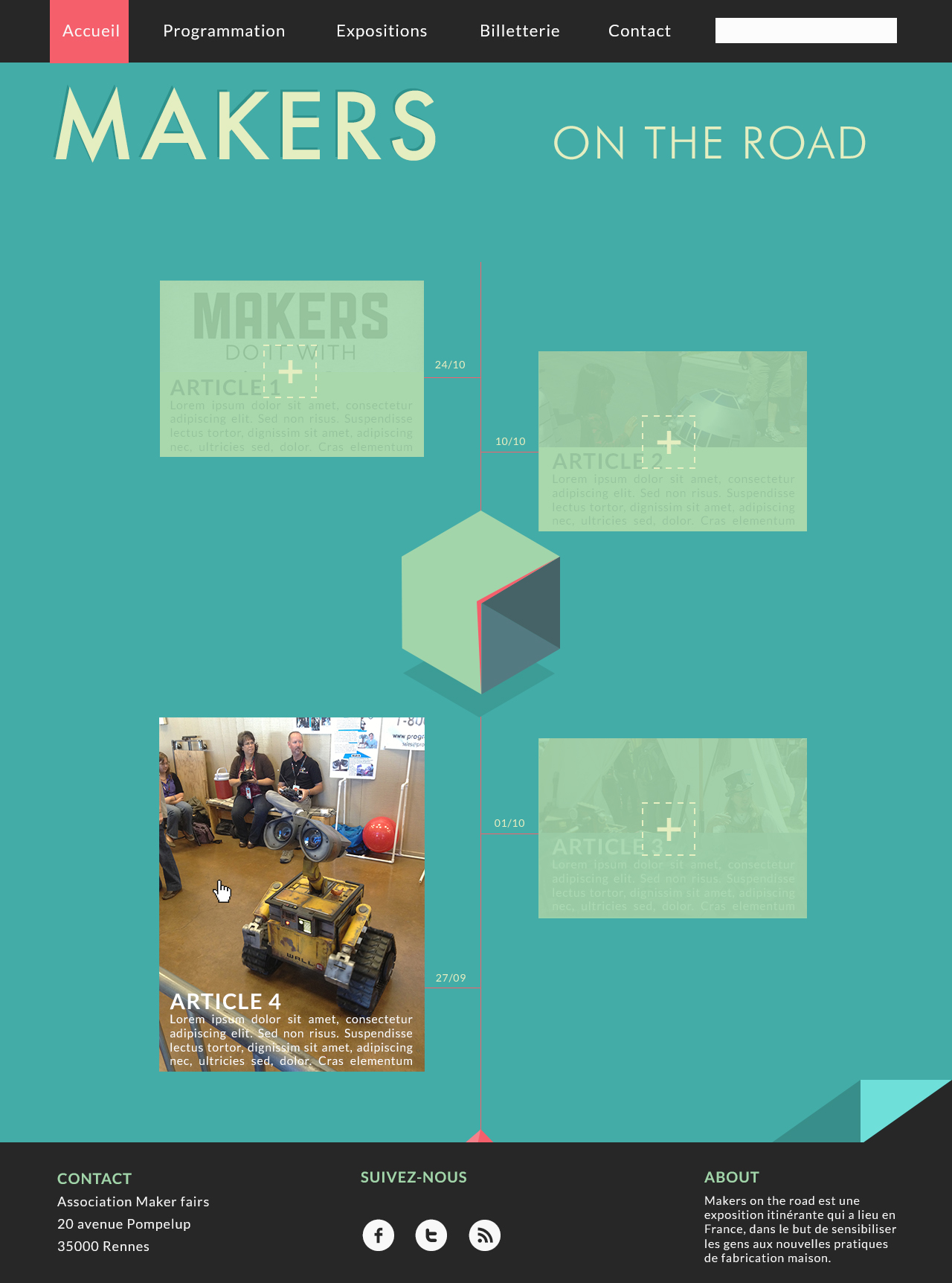 « Makers on the road » est un projet de design graphique et de webdesign pour un événement Maker Faire fictif qui ferait étape à Rennes. Plus grand mouvement au monde regroupant ateliers, présentations et conférences autour des thèmes de la créativité, de la fabrication et des cultures Do it yourself (DIY), la Maker Faire en est sa déclinaison française.